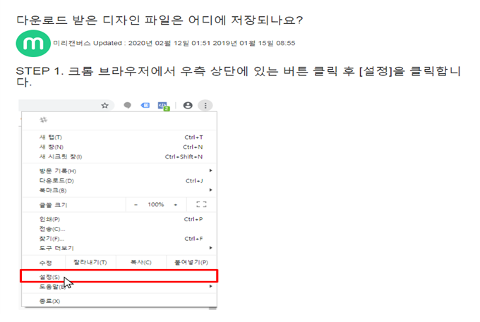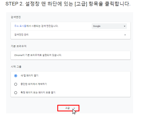 크롬 브라우저에서 우측상단 “설정”클릭한다