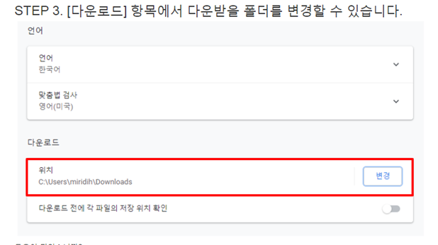 다운로드 항목에서 다운받을 폴더 변경 가능